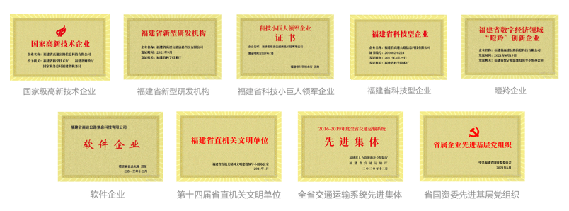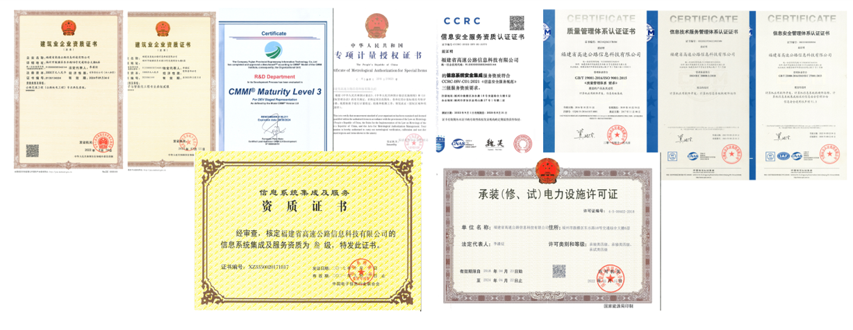 公司先后獲得“國家高新技術(shù)企業(yè)”“福建省軟件企業(yè)”“福建省科技小巨人企業(yè)”“福州高增企業(yè)”“瞪羚企業(yè)”等榮譽稱號,取得了公路交通工程(公路機電工程分項)專業(yè)承包壹級、電子與智能化工程專業(yè)承包壹級、信息系統(tǒng)集成及服務(wù)三級、電力承裝承修承試四級、軟件能力成熟度模型三級 (CMMI_3)認(rèn)證、電子汽車衡及動態(tài)公路衡器計量檢定授權(quán)許可、信息系統(tǒng)安全集成三級,以及ISO9001 質(zhì)量管理體系、 ISO20000 信息技木服務(wù)管理體系、1SO27001 信息安全管理體系認(rèn)證等系列資質(zhì);并擁有發(fā)明專利4項,實用新型專利12項,軟件著作權(quán)115項,參與行業(yè)標(biāo)準(zhǔn)編制1 項、地方標(biāo)準(zhǔn)編制 2 項。通過技術(shù)創(chuàng)新,促進我省高速公路的智能化系統(tǒng)建設(shè)和行業(yè)管理水平的不斷提升。