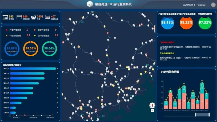 結(jié)合2020年取消省界收費站以后,高速公路收費模式由傳統(tǒng)的“出口收費”向“門架計費、出口收費”的轉(zhuǎn)變,通過采用物聯(lián)網(wǎng)、云邊協(xié)同、移動互聯(lián)網(wǎng)、人工智能、數(shù)據(jù)可視化等先進技術(shù),自主研發(fā)福建省高速公路ETC運行監(jiān)測平臺,實現(xiàn)全省車道、ETC門架和應(yīng)用系統(tǒng)實時狀態(tài)采集與運行監(jiān)測全覆蓋,提升全省高速公路收費關(guān)鍵設(shè)備運維的時效性與質(zhì)量,促進收費設(shè)備和系統(tǒng)的穩(wěn)定性。