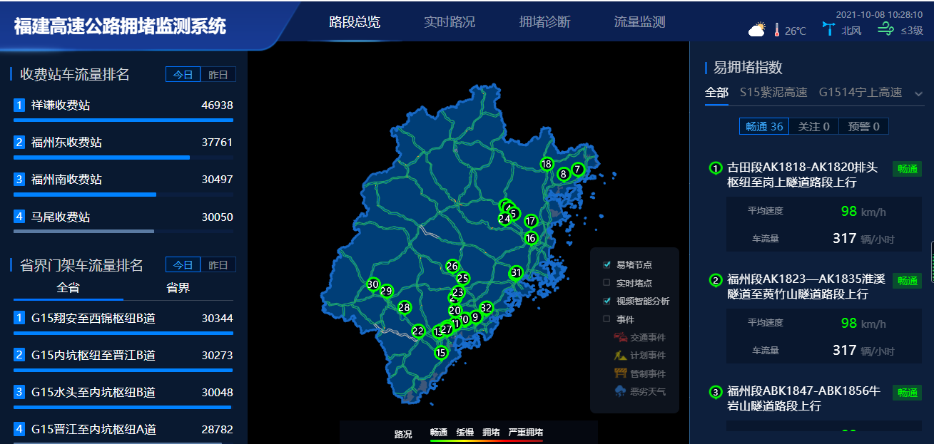 高速公路擁堵預(yù)警分析系統(tǒng)實(shí)現(xiàn)“一張網(wǎng)、一屏清”,具有以下特色:一是實(shí)現(xiàn)基于ETC門架數(shù)據(jù)易擁堵路段交通狀態(tài)評(píng)估分析。系統(tǒng)實(shí)時(shí)分析計(jì)算區(qū)間交通量、平均速度,并結(jié)合易擁堵路段歷史擁堵事件特性,建立擁堵評(píng)價(jià)指標(biāo),實(shí)現(xiàn)運(yùn)行狀態(tài)評(píng)估分析;二是實(shí)現(xiàn)多分辨率視頻AI智能分析。通過接入天龍山、崗山隧道視頻圖像,融合視頻AI分析技術(shù),實(shí)現(xiàn)對(duì)隧道內(nèi)車輛違停、交通擁堵等事件的及時(shí)識(shí)別,并可適應(yīng)全省隧道高清、標(biāo)清視頻圖像分辨率;三是實(shí)現(xiàn)路況局部精細(xì)化可視化展現(xiàn)。實(shí)現(xiàn)擁堵路段局部精細(xì)化展示,疊加收費(fèi)站、隧道、服務(wù)區(qū)等構(gòu)造物信息,實(shí)時(shí)輪巡區(qū)間內(nèi)視頻圖像,并對(duì)路段前后收費(fèi)站ETC門架交通流量進(jìn)行實(shí)時(shí)監(jiān)測(cè);四是實(shí)現(xiàn)路網(wǎng)交通流參數(shù)高精準(zhǔn)預(yù)測(cè)。利用卷積神經(jīng)網(wǎng)絡(luò)機(jī)器學(xué)習(xí)算法,通過歷史海量大數(shù)據(jù)的訓(xùn)練學(xué)習(xí),實(shí)現(xiàn)對(duì)區(qū)間流量、平均車速等指標(biāo)的較高精度預(yù)測(cè)。